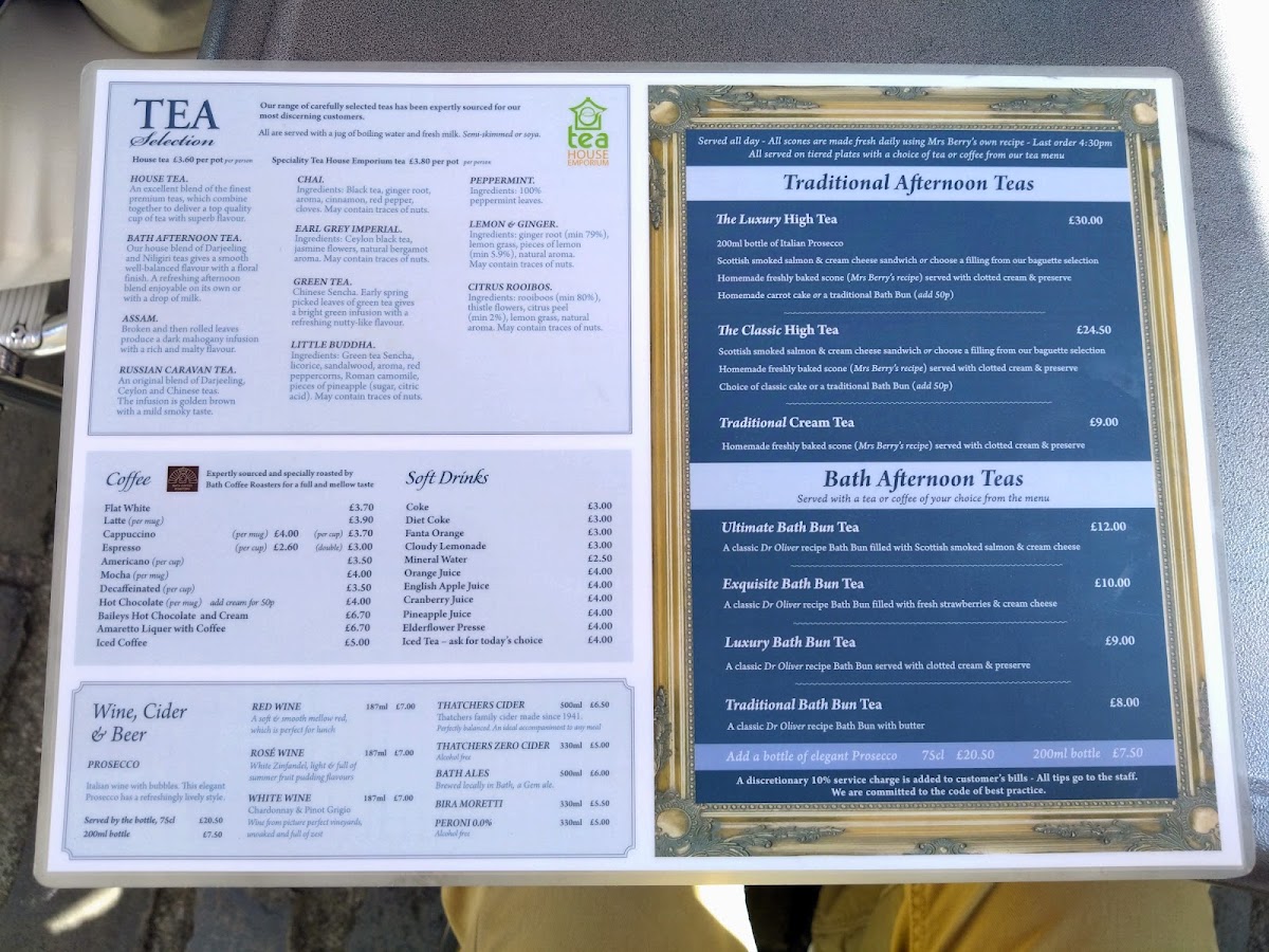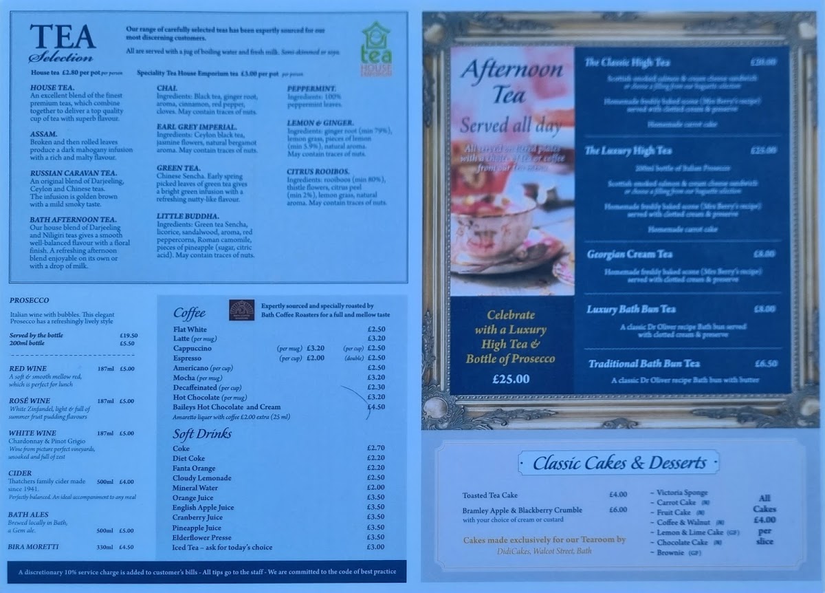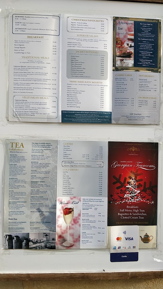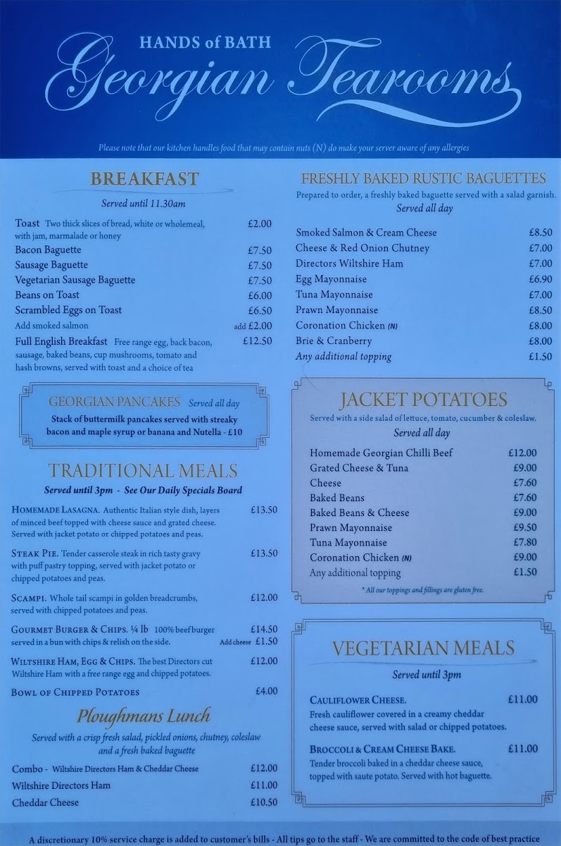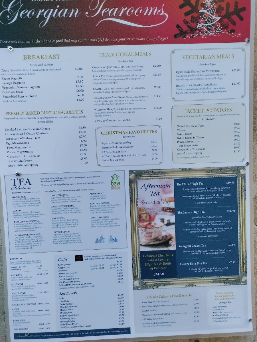 The menu at Georgian Tearooms in Bath offers a delightful variety of traditional and contemporary dishes, perfect for any time of day. For breakfast, diners can enjoy comforting options like Toast, Bacon Baguette, or the Vegetarian Sausage Baguette. Traditional meals include hearty choices such as Homemade Lasagna, Steak Pie, and Scampi, while the Gourmet Burger & Chips offers a satisfying twist on a classic. For something lighter, the Ploughman's Lunch provides a perfect combo of Wiltshire Directors Ham and Cheddar Cheese. Freshly baked rustic baguettes like Smoked Salmon & Cream Cheese and Cheese & Red Onion Chutney offer a delicious, casual option. If you’re in the mood for a comforting meal, the Jacket Potatoes come with creative toppings such as Homemade Georgian Chilli Beef or Grated Cheese & Tuna. For vegetarians, there are savory choices like Cauliflower Cheese and Broccoli & Cream Cheese Bake. The drinks menu includes familiar favorites such as Coke, Latte, and Americano, alongside seasonal treats like Spiced Mulled Wine. To round off your meal, there’s a tempting selection of Classic Cakes & Hot Desserts like the Bramley Apple & Blackberry Crumble and Traditional Christmas Pudding. For a special treat, the Luxury High Tea and Ultimate Bath Bun Tea are perfect indulgences. The drink selection includes a fine range of wines, Prosecco, and Bath Ales, making it a wonderful place to relax. Whether you're stopping by for a light bite or a full meal, the Georgian Tearooms offers something for everyone, all served with a charming touch of local flavor.